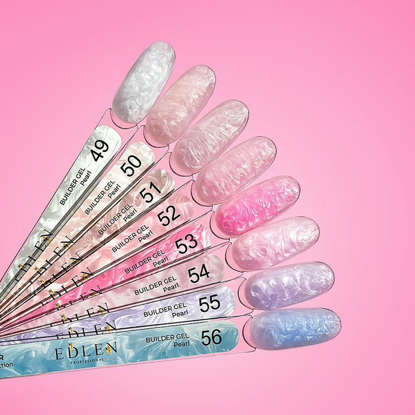 If you are doing an extension with an extension, to lay out the free edge, use Builder Gel Edlen No. 01 or No. 02, and not a product from the Pearl collection, as the high concentration of shimmer reduces the hardness.